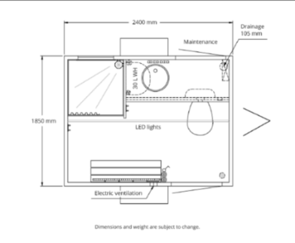 Waste Disposal: Waste from the bathroom will be pumped through an on-board macerator pump directly into your sewer system via an existing overflow relief gully, inspection point, or similar access point (ensure the grate can be removed). The distance the macerator pump can move waste depends on the level of the surface between the bathroom and the waste point. If the bathroom is downhill from the waste point, the distance will be shorter, and if uphill, it will be longer. Pop-Up Bathrooms Australia will provide up to 50 meters of AS3500 compliant waste hose for this connection, included in the delivery and setup fee. Pop-Up Bathroom Australia can also supply a waste holding tank on request, perfect for remote locations.